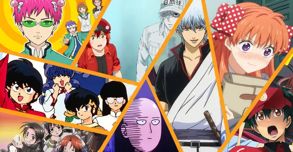 Estas series se distinguen por combinar elementos de otros géneros, ya sean escenas de romance, suspenso o acción, pero con un fuerte énfasis en las bromas y chistes que se prestan ante cada situación. De hecho es normal que algunas de estas series sean vistas como una parodia para alguno de los géneros ya mencionados anteriormente. En algunos casos hasta se hacen referencias directas a otras series populares de anime pero dentro de un contexto más cómico. Y dependiendo de su sentido del humor, algunos anime de comedia pueden llegar incluso a ser considerados para adultos. Aquí se destacan obras como Aggretsuko, Gintama, One Punch Man y The Disastrous Life of Saiki K.
